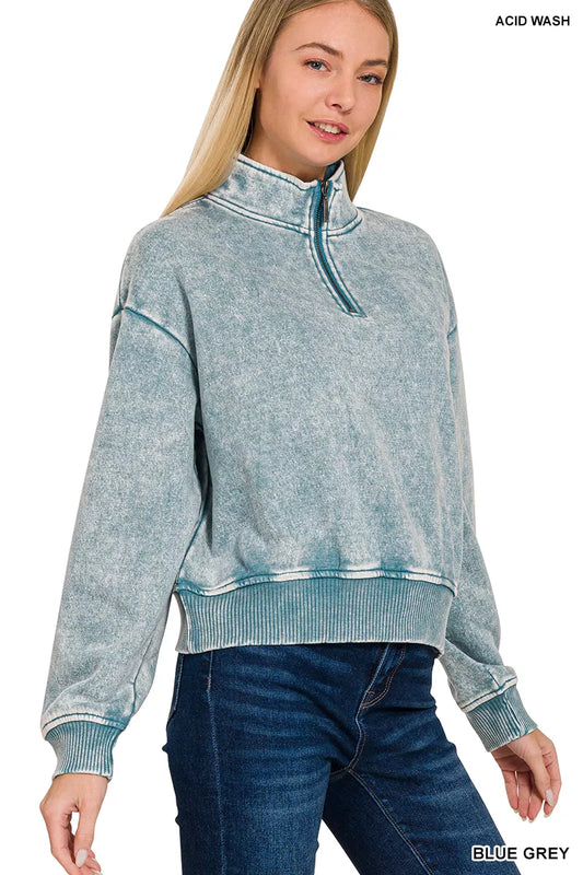 ONLINE EXCLUSIVE Zenana Acid Wash Fleece Half Zip Sweatshirt