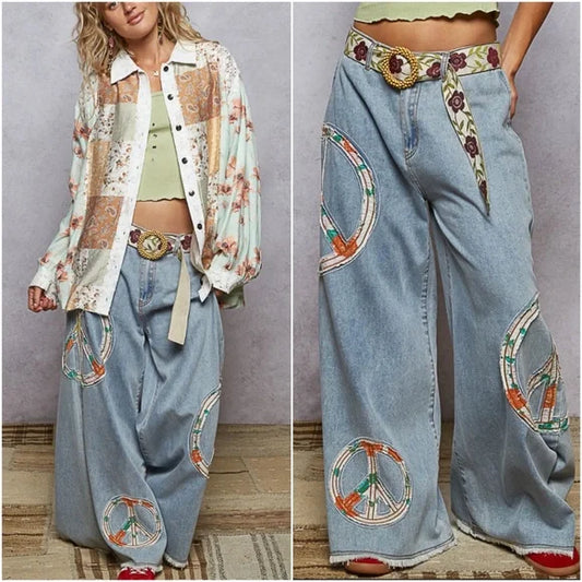 POL Peace Patchwork Light Wash Wide leg Denim Jean pants