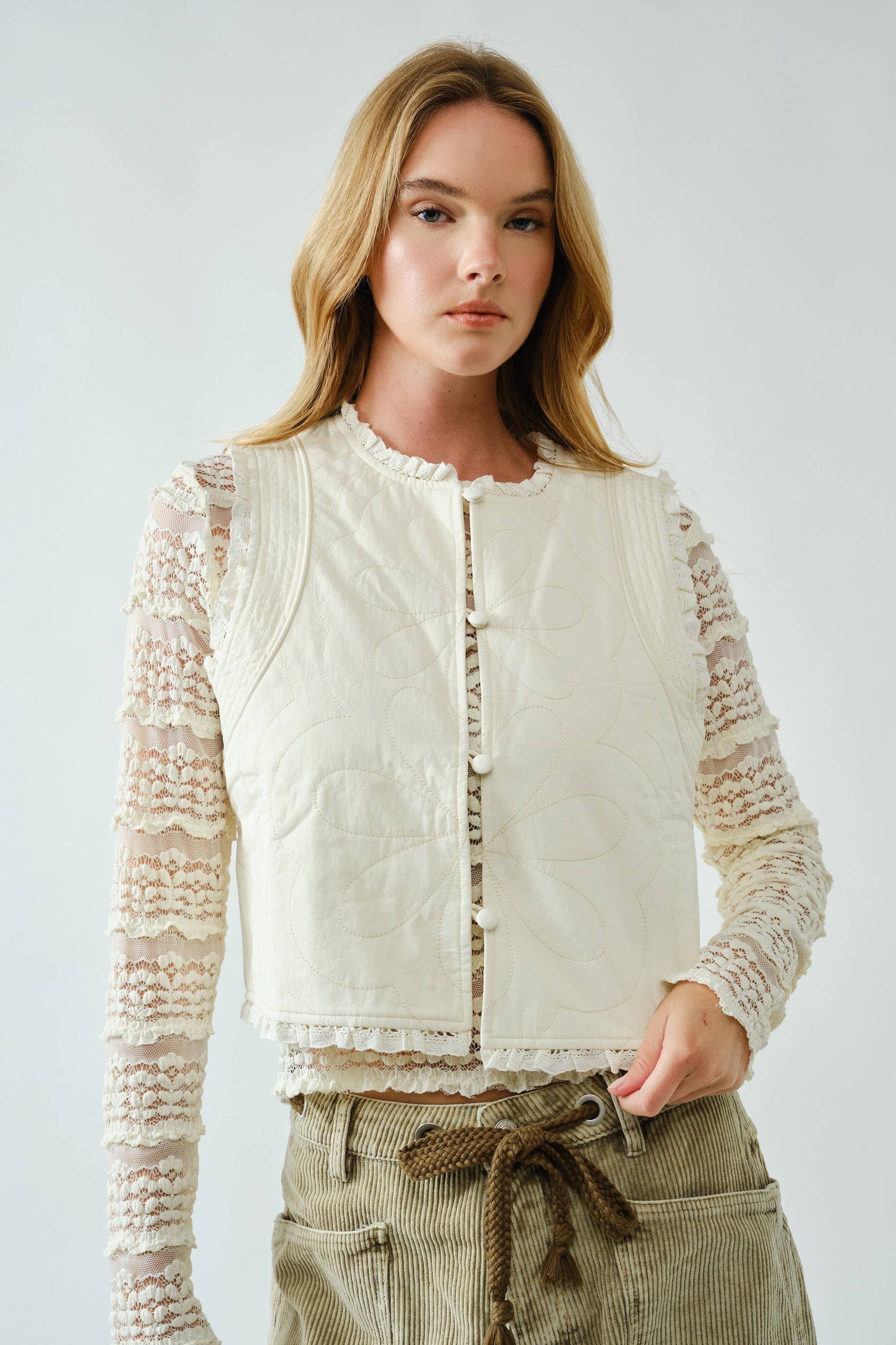 Crafted from soft cotton, this vest features delicate quilted floral stitching, a feminine ruffle trim along the neckline and hem, and fabric-covered button closures for an elegant finish.