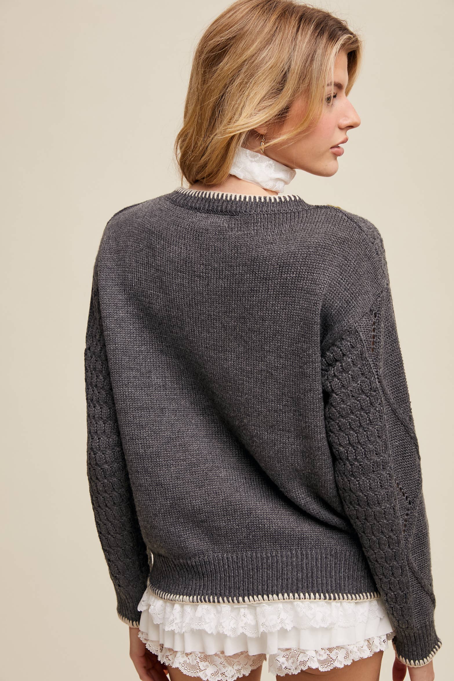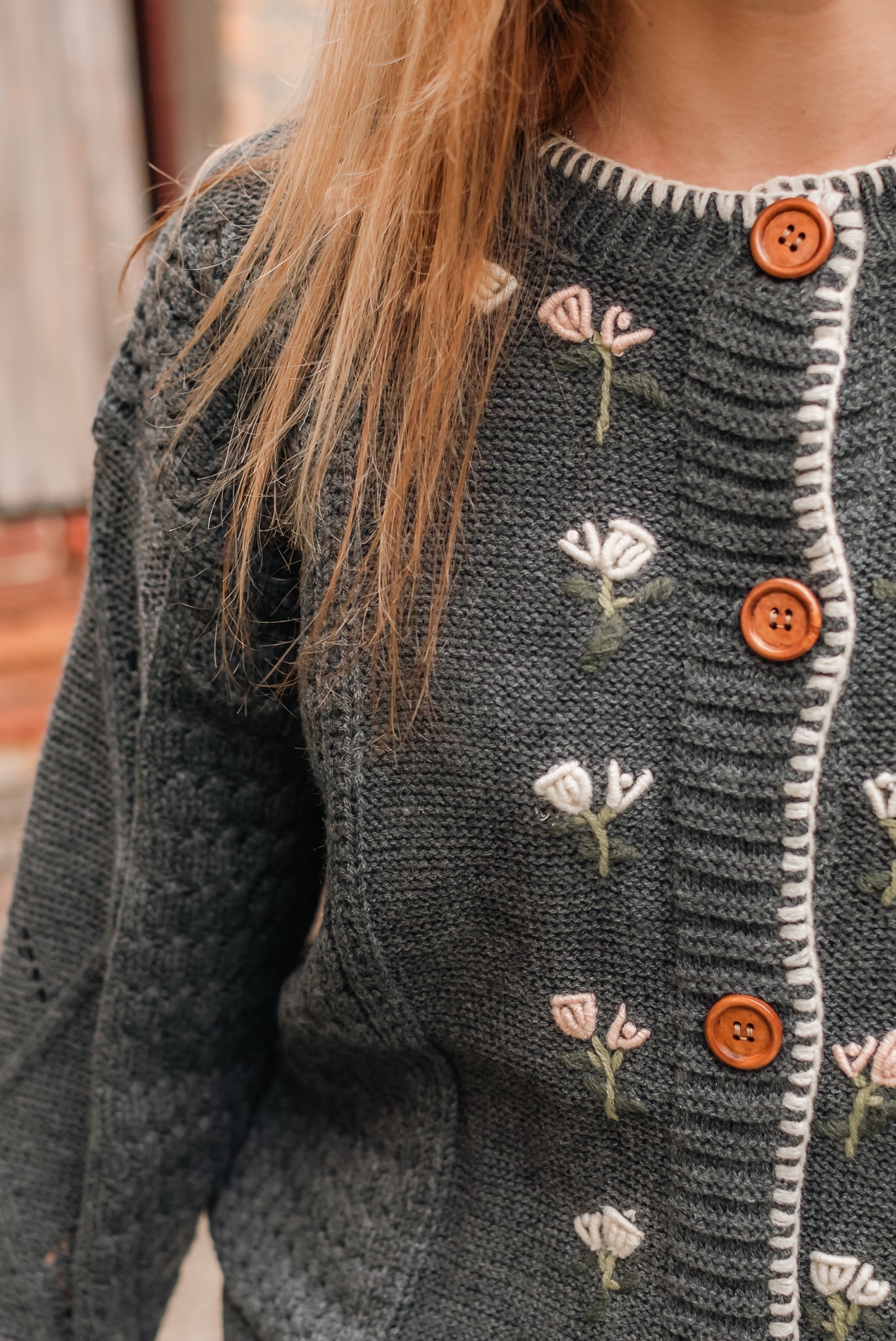 The Nova Floral Embroidered Cardigan brings effortless elegance to your seasonal wardrobe. Delicate flower embroidery cascades down the front, creating a romantic focal point that pairs beautifully with the textured cable knit sleeves and classic flat knit body. Warm wooden buttons add vintage charm, while contrast whipstitch detailing at the neckline, cuffs, and hem provides sophisticated finishing touches.