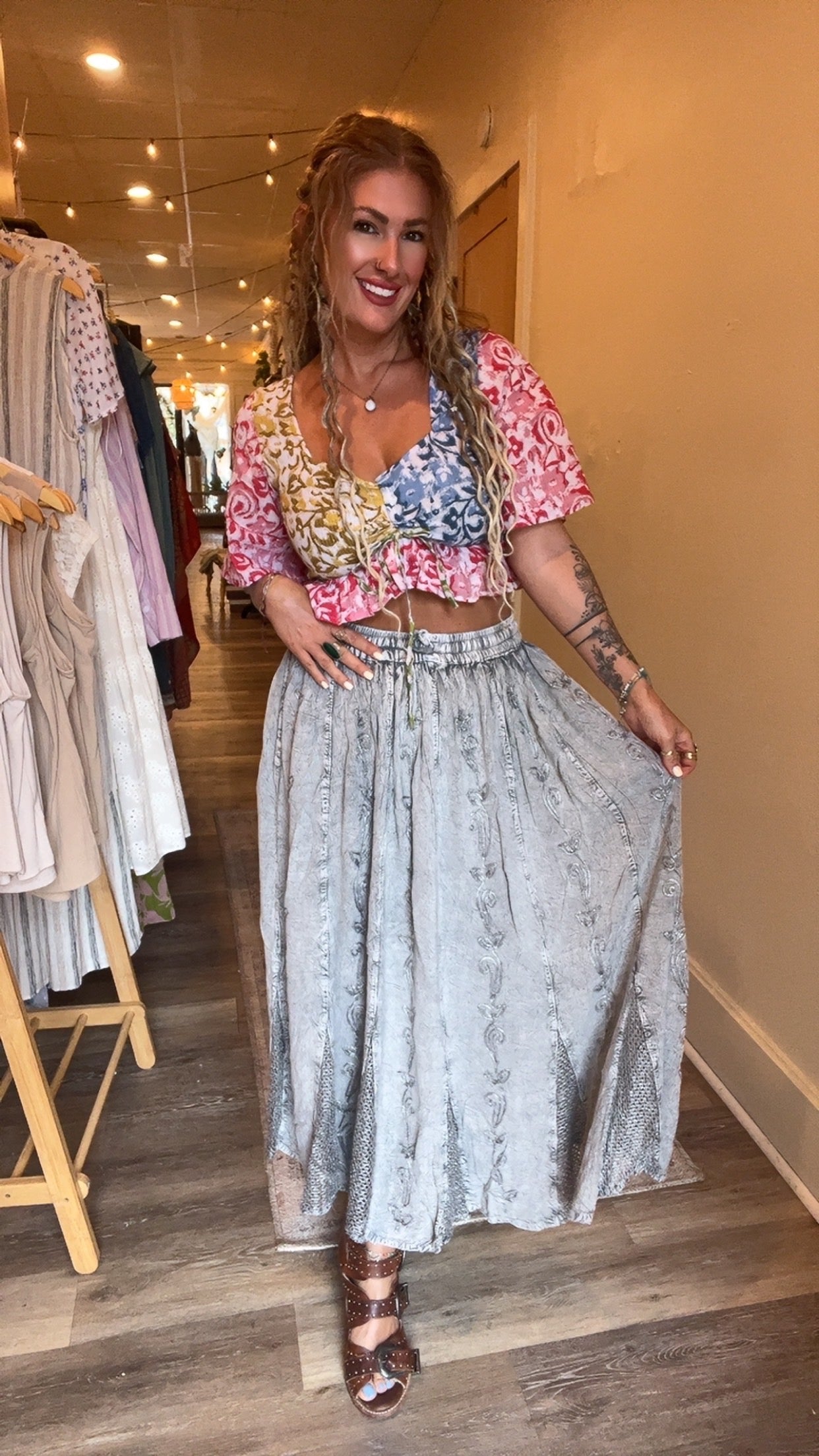 This handcrafted boho maxi skirt in a chic neutral gray brings effortless style with its subtle patterns and playful mesh accents along the hem.