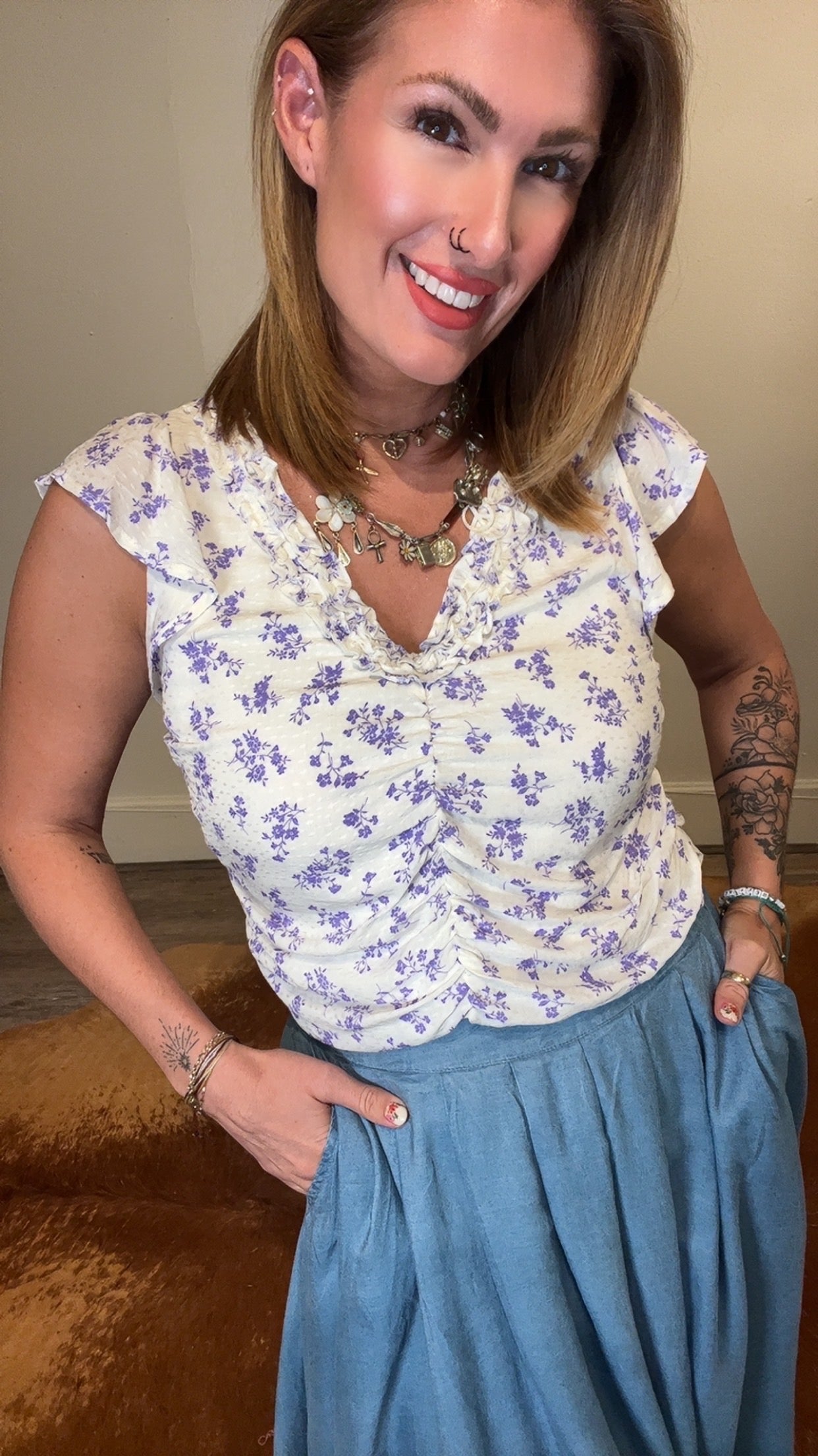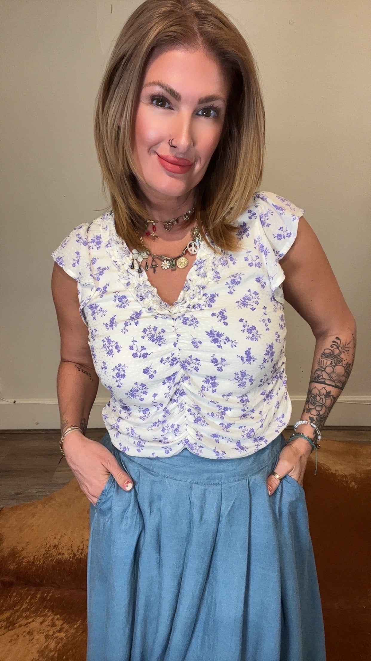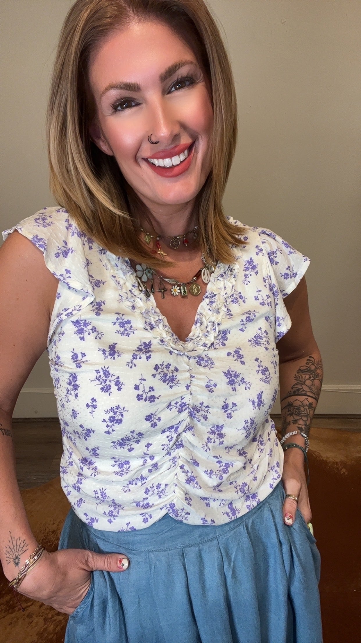 The short flutter sleeves and elastic hem add a trendy cropped length, perfect for pairing with high-waisted bottoms.