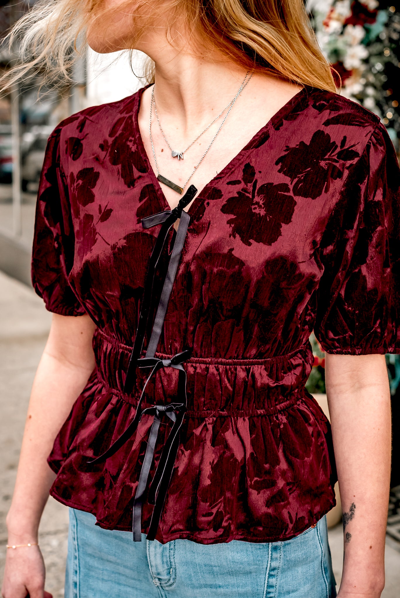 The front velvet tie strap adds a charming detail, while the shirred waistline creates a refined silhouette. Luxurious velvet trim accents the peplum hem, and an enchanting satin velvet floral pattern brings movement and visual interest.