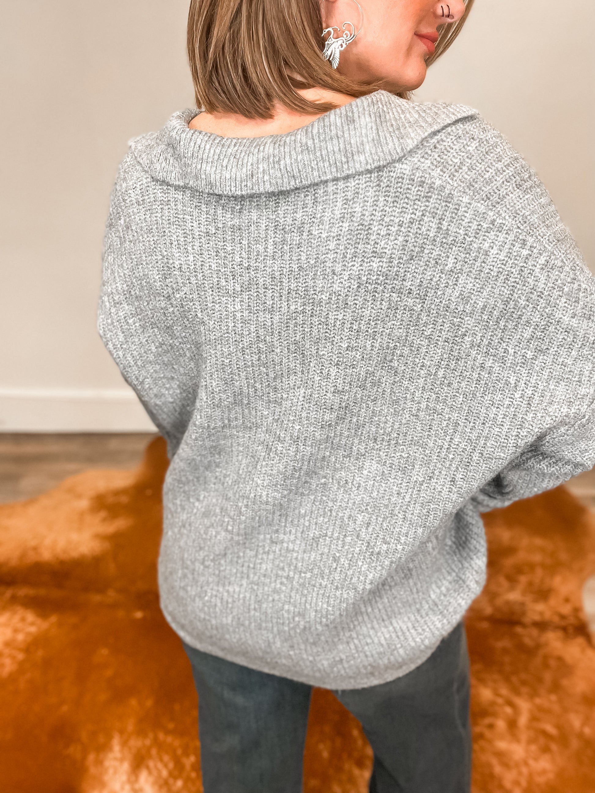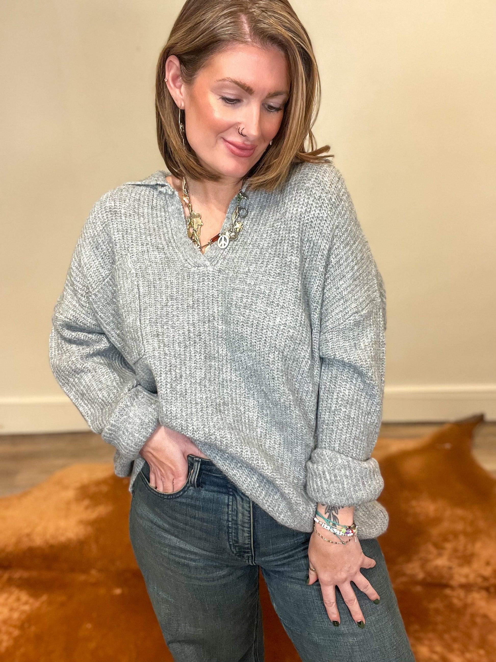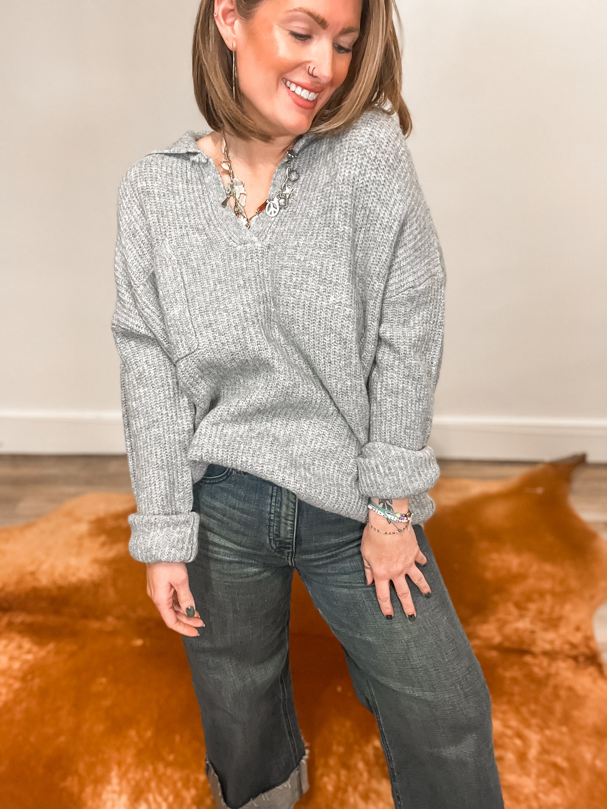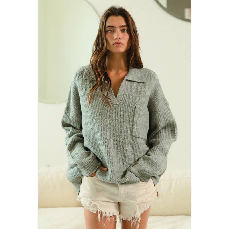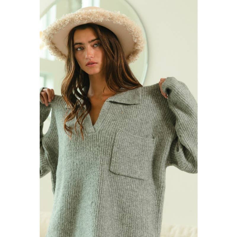 The Sweater Knit Collar Top with Front Pocket is a stylish and practical piece that combines comfort with a chic, casual look.
